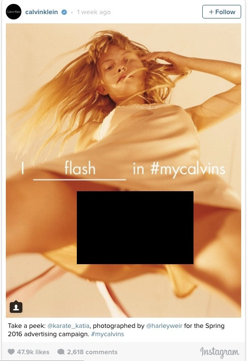 Năm 2016, hãng nội y Calvin Klein phải hứng chịu không ít chỉ trích về poster quảng cáo cho bộ sưu tập thu đông. Trong ảnh, nữ diễn viên Klara Kristen được chụp hình bằng máy ảnh với góc máy hướng thẳng lên bộ phận nhạy cảm. Sau này áp lực dư luận quá lớn, buộc hãng phải gỡ tấm hình quảng cáo này.