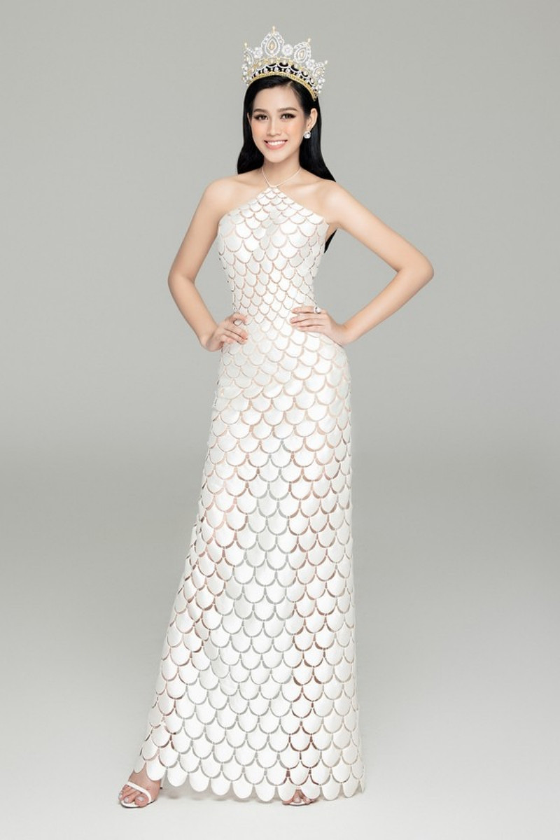 Một mẫu váy khác kiểu dáng cổ yếm ôm sát tương tự, là một thiết kế xuyên thấu của NTK Công Trí. Chiếc váy đã biến Hoa hậu Tiểu Vy thành “nữ hoàng thảm đỏ” trong buổi họp báo Chung kết Hoa Hậu Việt Nam 2020.
