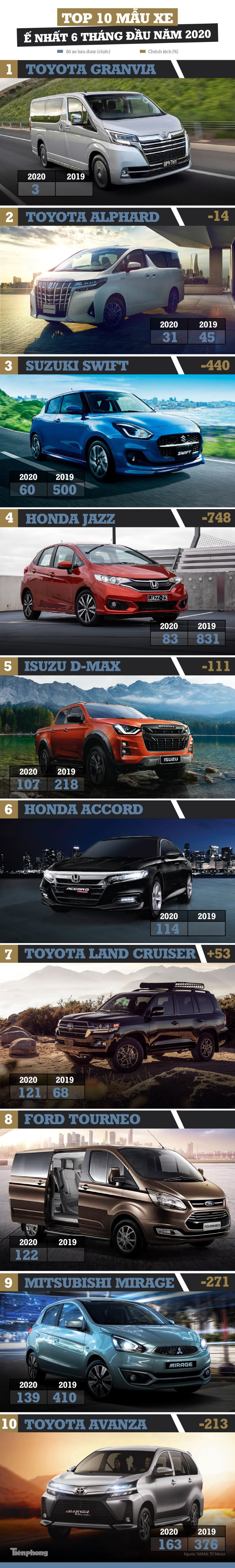 TPO - Do ảnh hưởng từ dịch COVID-19, nửa đầu năm 2020 chứng kiến sự sụt giảm mạnh về doanh số so với những năm trước. Vì vậy, đa số các mẫu trong danh sách xe bán chậm nhất đều có số lượng bán ra thấp hơn cùng kỳ năm ngoái khá nhiều.