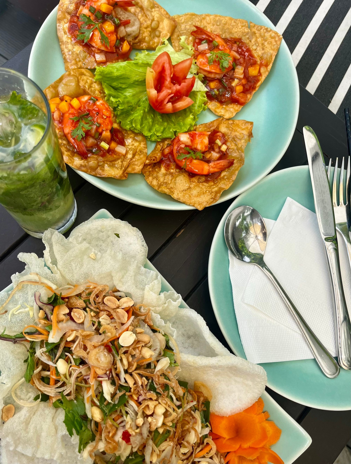 Một món ăn khác xuất hiện trong danh sách nên thử tại Hội An là hoành thánh chiên giòn. Vỏ bánh được làm từ bột mì. Sau khi chiên giòn, đầu bếp sẽ phủ lên trên một lớp tôm tươi, salad xoài chua ngọt.