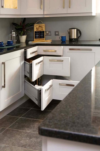 Khu vực góc của bàn bếp đã được xử lý lại hiệu quả với khả năng chứa nhiều đồ.