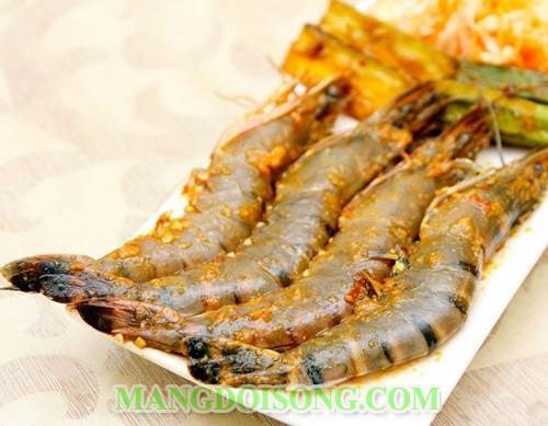 Cho tôm vào ướp 20 phút với hỗn hợp dầu trên cho ngấm sau đó dùng xiên tre xiên dọc tôm từ đuôi lên đầu. Xếp đầu hành vào một cái ly và cho đá nhuyễn vào cho lạnh. Ảnh: mangdoisong.com.