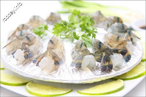 5. Tôm nhúng mù tạt. Nguyên liệu: Tôm, mù tạt, chanh, ớt, hành, xì dầu, đá bi. Tôm lột sạch vỏ, chừa đuôi, cắt bỏ lấy chỉ lưng sau đó ướp với đá bi trong vòng 10 phút. Nặn 5 quả chanh ra chén nhỏ, sau đó lấy tôm nhúng tôm để khoảng 10 phút. Ảnh: Cooky.vn.