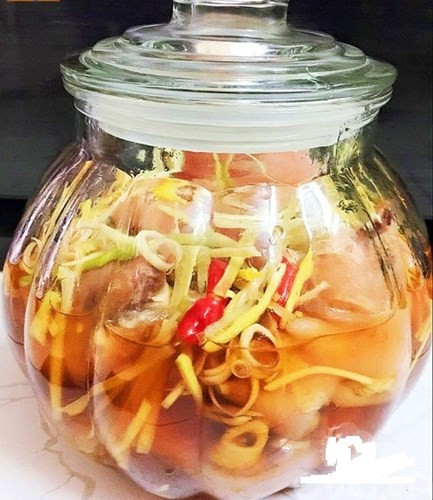 Xếp móng giò vào lọ thuỷ tinh, rồi đổ hỗn hợp nước ngâm lên, đến khi ngập nước trên chân giò. Bạn ngâm khoảng 1-2 ngày là có thể dùng được.