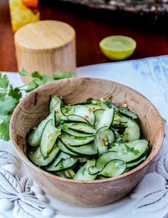 Salat dưa chuột thái lát mỏng vắt chanh, một chút mắm, tỏi bằm và rau mùi