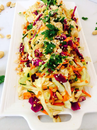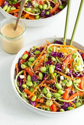Món salat nhiều màu sắc này gồm có cà chua, ớt chuông đỏ, cà rốt, cải bắp tím, dầu giấm và rắc vừng