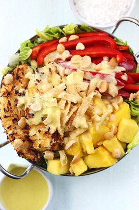 Món salat lạ miệng này gồm có dứa nướng, rau diếp, ớt chuông đỏ và rắc lạc lên trên