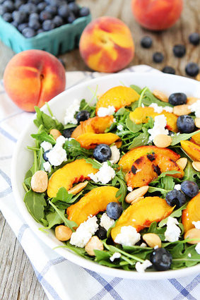 Quả đào thái miếng, cho vào lò nướng, sau đó trộn với quả việt quất và phô mai, có thể thêm hạt điều, rau tùy thích