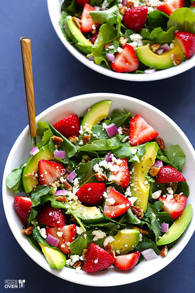 Món salat đẹp xinh này gồm có dâu tây thái miếng nhỏ, quả bơ thái miếng, rau cải, phô mai và dầu giấm