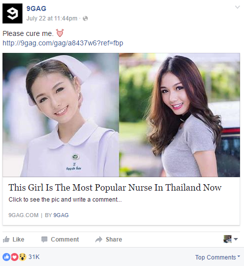 Bài đăng trên 9Gag nhanh chóng thu hút 31.000 like (thích), hàng trăm nghìn share và bình luận. Sau 2 ngày “nổi đình đám” trên mạng, số người theo dõi Facebook cô tăng gần 15.000, Instagram cũng có tới 14.000 followers. Ảnh: Instagram NV.