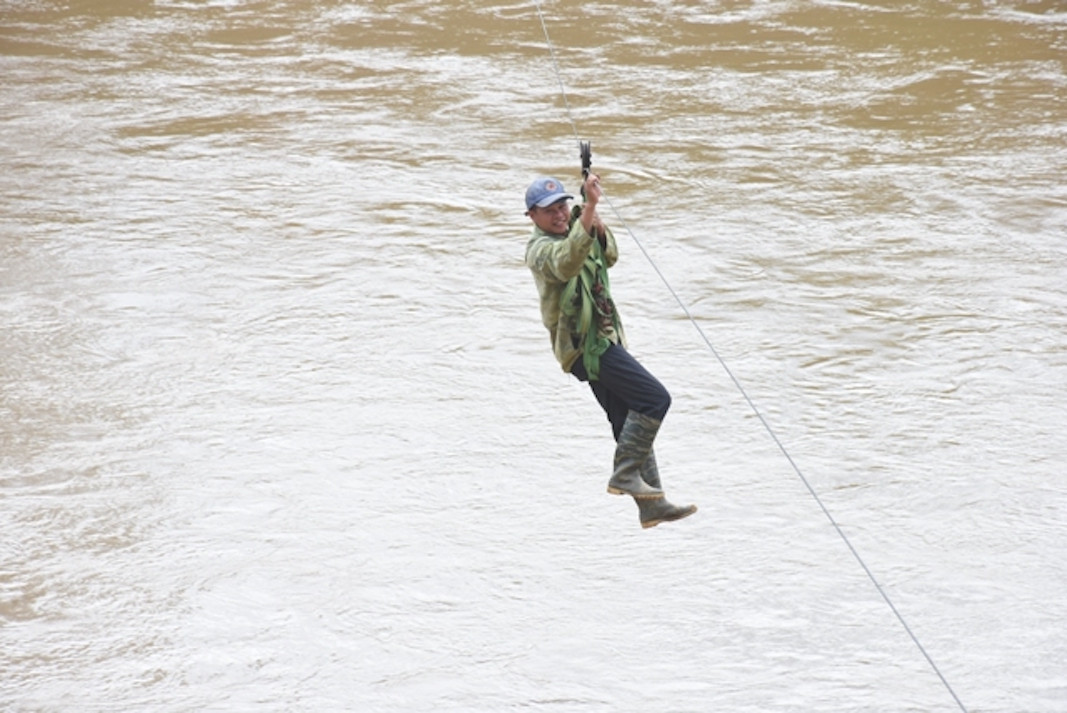 Người đu cáp qua sông khi tới bờ cần một người khác hỗ trợ, cầm sào kéo vào