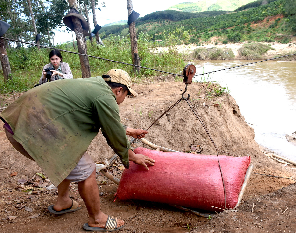 Người dân xã ĐắK Nông liều mình đu dây qua sông để thu nông sản