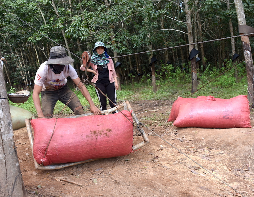 Những bao cà phê được đóng bao, chuẩn bị được đẩy qua sông Pô Cô sang bờ bên kia