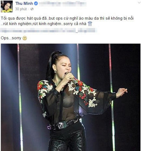 Cô viết: “Ngay mai lỡ nàng có bị vô sao xấu cũng đừng buồn nha cả nhà vì hôm nay mặc áo ren hơi xuyên thấu sẹc xy. Khi chụp hình bị đèn flash soi vô thấy áo ngực nha, chứ lên sân khấu không thấy gì cả”. Sau chia sẻ, Phương Thanh nhận được nhiều động viên đây là tai nạn không mong muốn.