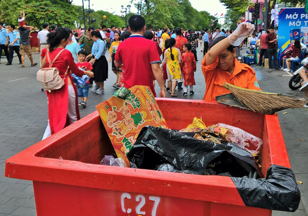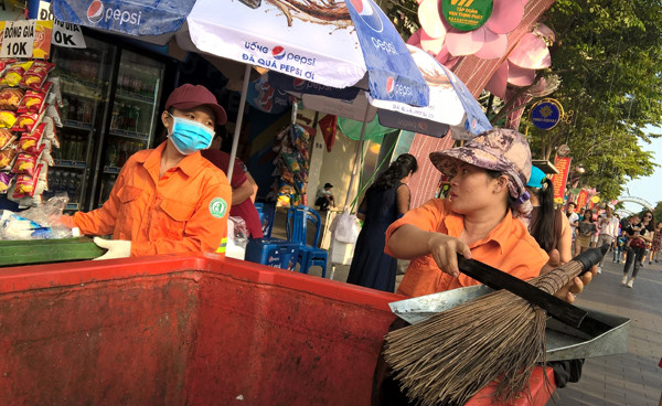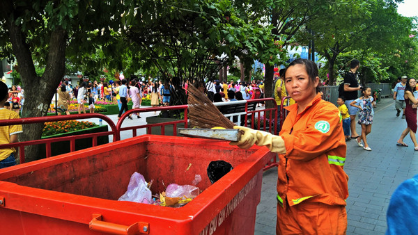 Công việc dọn rác ở đường hoa rất cực nhọc và cần sự khéo léo của bàn tay phụ nữ nên không dễ tìm ra được công nhân. Trong ảnh là chị Giang có thâm niên mấy chục năm quét rác, chị đã nghỉ hưu nhưng do đường hoa thiếu nhân lực nên chị được công ty mời trở lại làm trong dịp Tết Kỷ Hợi. Chị đã vui vẻ nhận lời và ngày Tết của chị năm nay lại vất vả hơn ngày thường. .