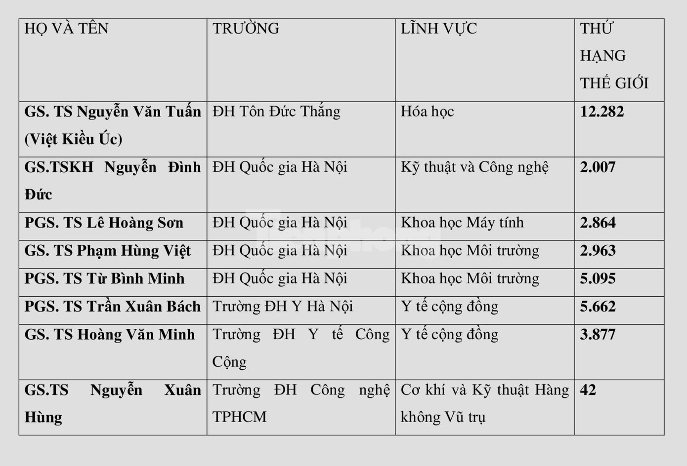 Như vậy, trên thực tế, theo bảng xếp hạng này, thực lực các nhà khoa học Việt Nam đang sinh sống và làm việc trong nước chỉ có mặt trong 6 lĩnh vực là: Kỹ thuật Công nghệ, Khoa học Máy Tính, Khoa học Môi trường, Khoa học Vật Liệu, Cơ khí và Kỹ thuật hàng không vũ trụ, Y học cộng đồng, và chỉ có 11 người được có tên trong bảng xếp hạng theo các lĩnh vực.