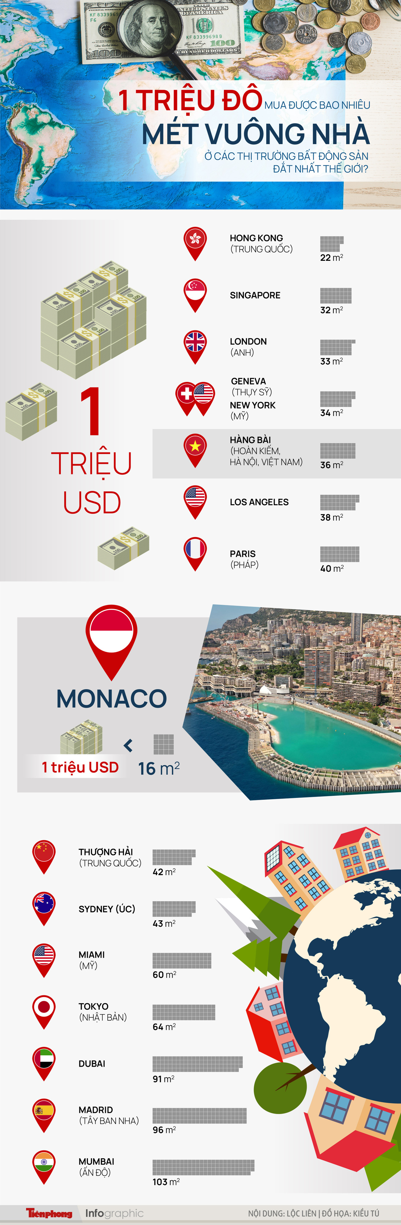 TPO - Theo khảo sát của Knight Frank, Bloomberg, với 1 triệu đô la Mỹ (hơn 24,5 tỷ đồng) người mua nhà chỉ có thể mua được 16 m2 nhà ở Monaco - công quốc châu Âu có mật độ người giàu dày đặc và 36 m2 nhà ở tại khu vực Hàng Bài quận Hoàn Kiếm (Hà Nội). Ở những nước khác có giá bất động sản (BĐS) đắt đỏ trên thế giới thì sao?