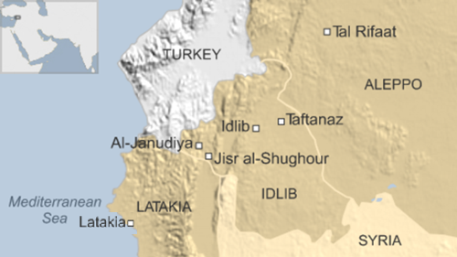 Phiến quân thân al-Qaeda là Mặt trận Nusra (Nusra Front) cũng chiếm một phần tỉnh Idlib. Nusra còn kiểm soát tuyến đường chính nối từ Latakia tới Idlib, cùng phần lớn vùng đồng bằng Sahl al-Ghab ở phía đông nam thành phố.