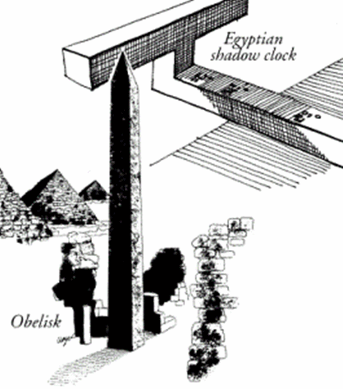 Đồng hồ Mặt Trời do người Ai Cập cổ đại phát minh có dạng tháp. Dựa trên bóng của tháp di chuyển trên mặt đất, người Ai Cập chia ngày thành sáng và chiều. Họ xác định thời gian, ngày dài nhất và ngắn nhất trong năm cũng dựa trên đồng hồ Mặt Trời.