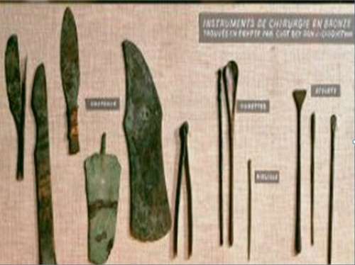 Trong ảnh là dụng cụ phẫu thuật của người Ai Cập cổ đại. Tài liệu y khoa đầu tiên còn sót lại cho đến ngày nay là cuốn Edwin Smith Papyrus. Cuốn sách mô tả 48 trường hợp phẫu thuật thương tích phần đầu, cổ, vai, vú, ngực. Nó cũng liệt kê danh sách dụng cụ dùng trong quá trình phẫu thuật như xơ vải buộc vết thương, gạc, băng dán, kim, chỉ khâu phẫu thuật. Ngày nay, du khách tới bảo tàng Cairo có thể quan sát bộ sưu tập dụng cụ phẫu thuật của người Ai Cập bao gồm: dao, kéo, kim đồng, kẹp, thìa, lưỡi trích, móc, thiết bị thăm dò và kìm.