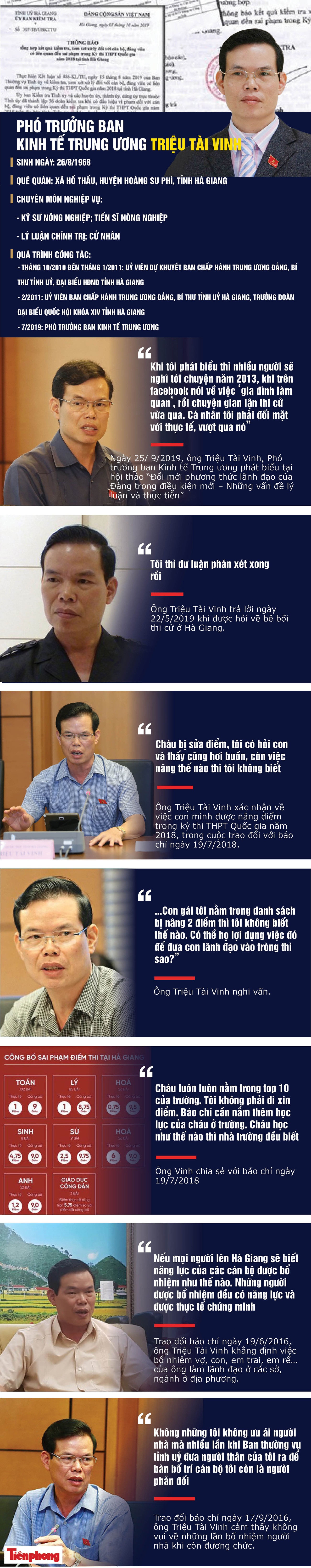 TPO - Ngày 1/10, Ủy ban Kiểm tra Tỉnh ủy Hà Giang công bố thông báo về kết quả xem xét, xử lý kỷ luật đối với 151 cán bộ, đảng viên. Đáng chú ý, trong số 29 cán bộ, đảng viên chưa đến mức áp dụng hình thức kỷ luật, yêu cầu kiểm điểm sâu sắc, nghiêm túc rút kinh nghiệm có bà Phạm Thị Hà, Phó giám đốc sở NN&PTNT, là vợ nguyên Bí thư Tỉnh ủy Hà Giang Triệu Tài Vinh. Khi còn làm Bí thư tỉnh ủy, ông Vinh đã có nhiều phát ngôn gây xôn xao dư luận.