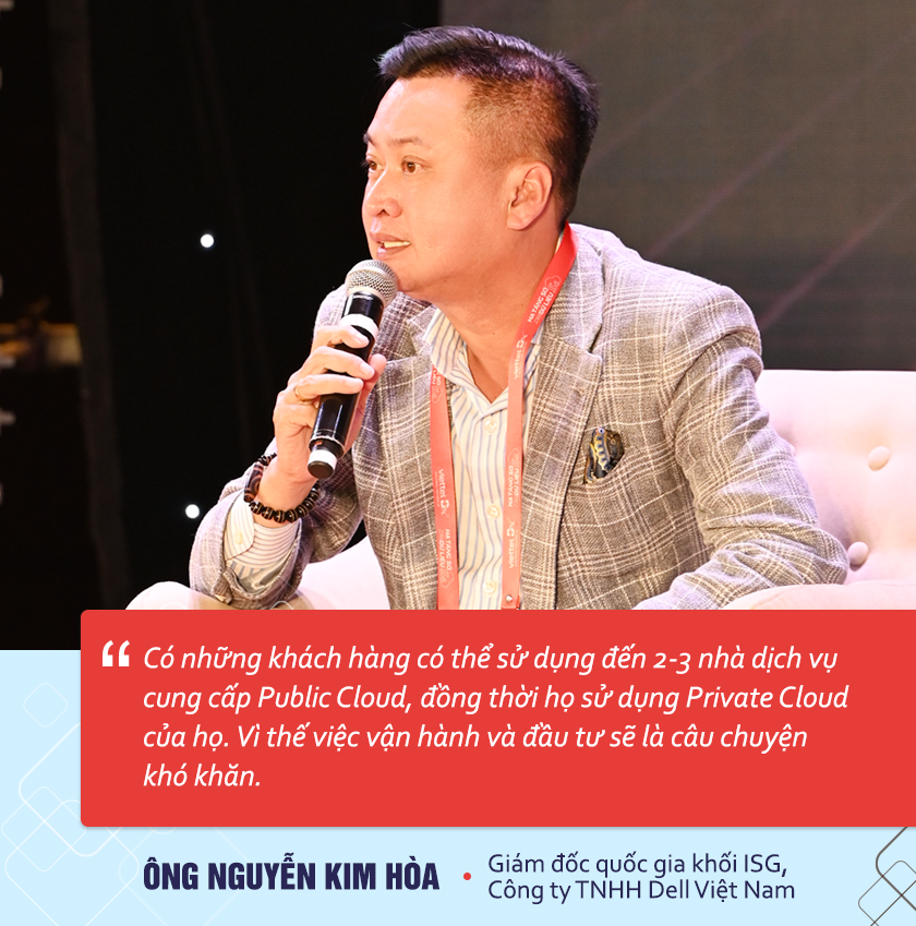 Tiến đến phần thảo luận được điều phối bởi ông Lê Quang Hiếu - Phó Tổng giám đốc Viettel Solutions, ông Nguyễn Kim Hòa, Giám đốc quốc gia khối ISG, Công ty TNHH Dell Việt Nam nhấn mạnh tín hiệu đáng mừng, là nhiều doanh nghiệp đã dịch chuyển từ đầu tư, mua (CAPEX) sang thuê cơ sở hạ tầng sang Cloud (OPEX).