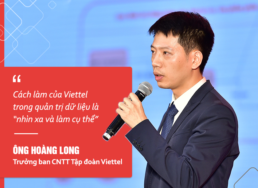 Tham luận về chủ đề quản trị dữ liệu, theo ông Hoàng Long Trưởng ban CNTT Tập đoàn Viettel, để quản trị dữ liệu, điều quan trọng nhất là người đứng đầu phải nhận thấy đây là việc quan trọng, thì bộ máy bên dưới mới có thể triển khai. Thứ hai, về vấn đề nguồn lực, đây là lĩnh vực rất khó tuyển dụng ở Việt Nam, mà chỉ có thể chuyển đổi nhân sự nội bộ sang tự đào tạo.