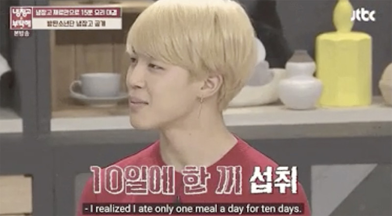 Thời điểm trước khi quay MV Blood, Sweat and Tears, Jimin đã quyết định giảm cân bằng cách mỗi ngày chỉ ăn duy nhất một bữa ăn. Jimin đã thực hiện việc này trong một tuần, và cuối cùng cậu ấy đã sớm nhận ra chế độ ăn kiêng này tệ đến mức nào, Jimin quyết định không bao giờ thử lại việc ăn kiêng ngớ ngẩn và nguy hiểm như vậy nữa.