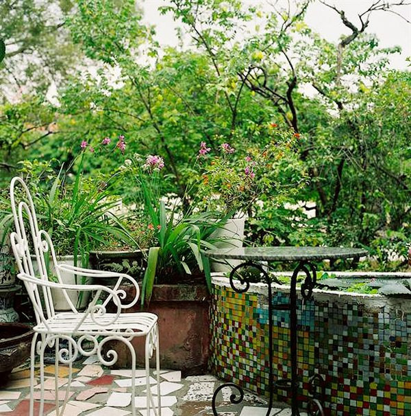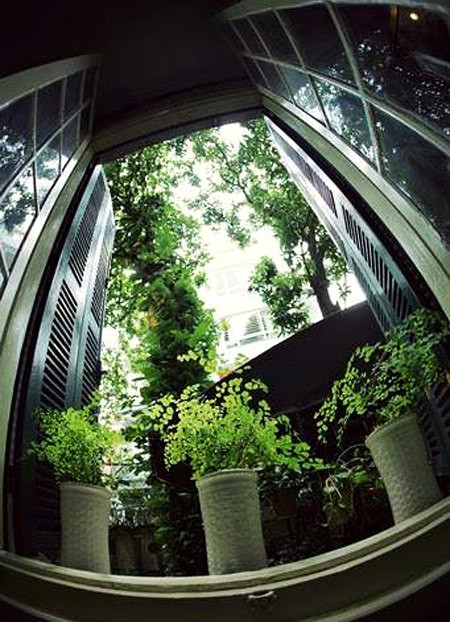 Bậc thềm rêu phong cùng những chậu cây cảnh xinh xắn, thấp thoáng sau ô cửa sổ rộng thoáng, đôi chỗ đã rêu mục nhưng rất sang trọng và kiêu kỳ. Tiếng nhạc dịu dàng đâu đó vọng ra từ góc vườn khiến bạn như hòa mình vào một không gian hoàn toàn yên tĩnh, ngập tràn màu xanh của cây lá.