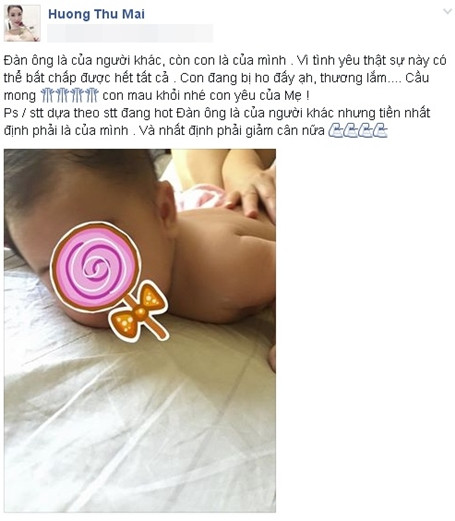 Em vẫn đang phấn đấu mỗi ngày để chăm con thật tốt. Đôi khi em cũng chạnh lòng khi thấy con người ta đủ cha đủ mẹ chăm sóc. Nhưng âu là duyên phận. Bé là con em thì bé sẽ đặc biệt được thương yêu bù đắp nhiều hơn. Bằng chứng là niềm hạnh phúc vẫn lấp lánh ở khoé mắt bé mỗi ngày. Đúng không ạ??”.