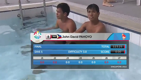 Sự cố gây cười nhất tại SEA Games 28 là về hai VĐV nhảy cầu người Philippines John Elmerson Fabriga và John David Pahoyo khi lần lượt nhận toàn điểm 0 từ 7 giám khảo sau khi mắc lỗi tiếp nước sơ đẳng trong bài thi 3m cầu mềm. Trong khi nhiều người chế giễu 'cặp anh em té nước', cho rằng cả hai cố tình thực hiện lỗi để gây chú ý, không ít người lại có ý kiến bênh vực hai VĐV trẻ này và coi đó chỉ là tai nạn ngoài ý muốn.