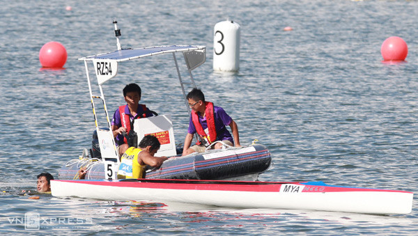 Cặp VĐV giành HC vàng chèo thuyền nội dung C2-1000m người Myanmar do vội vào bờ để chia sẻ niềm vui với đồng đội nên bị lật thuyền ngã nhào xuống nước.