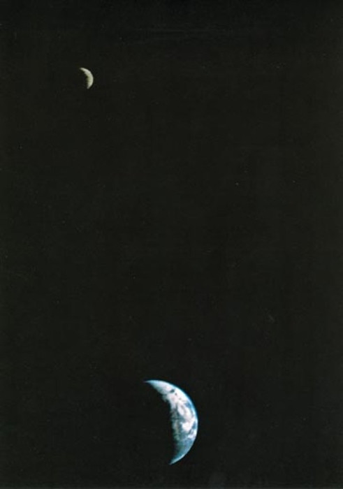 'Trái đất và mặt trăng', 1977. 13 ngày sau khi đặt chân lên sao Mộc (5/9/1977), con tàu Voyager 1 quay trở lại quỹ đạo và chụp lại bức ảnh mô tả khoảng cách giữa Trái Đất và Mặt Trăng trong không gian vũ trụ.