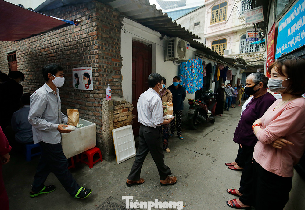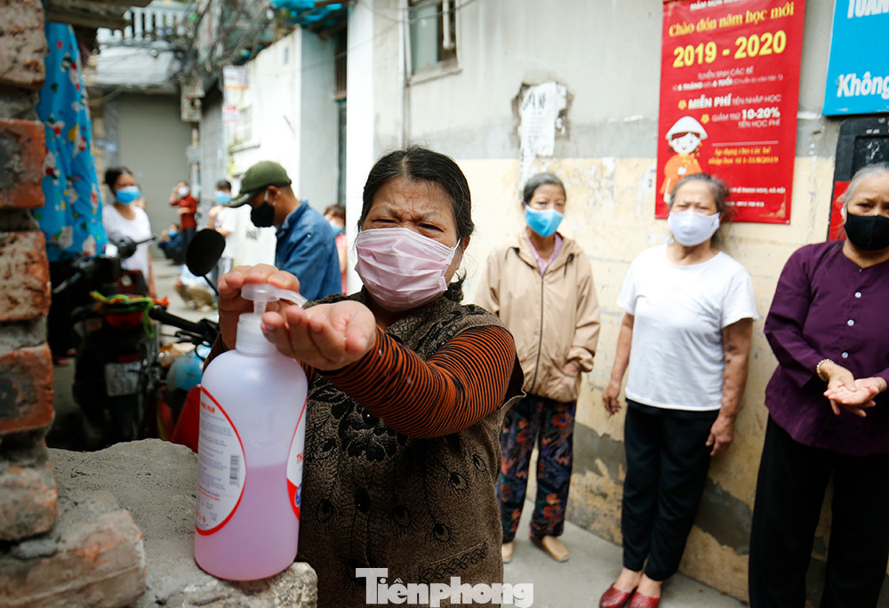 Trước khi vào nhận bánh và quà, người dân rửa tay khử khuẩn
