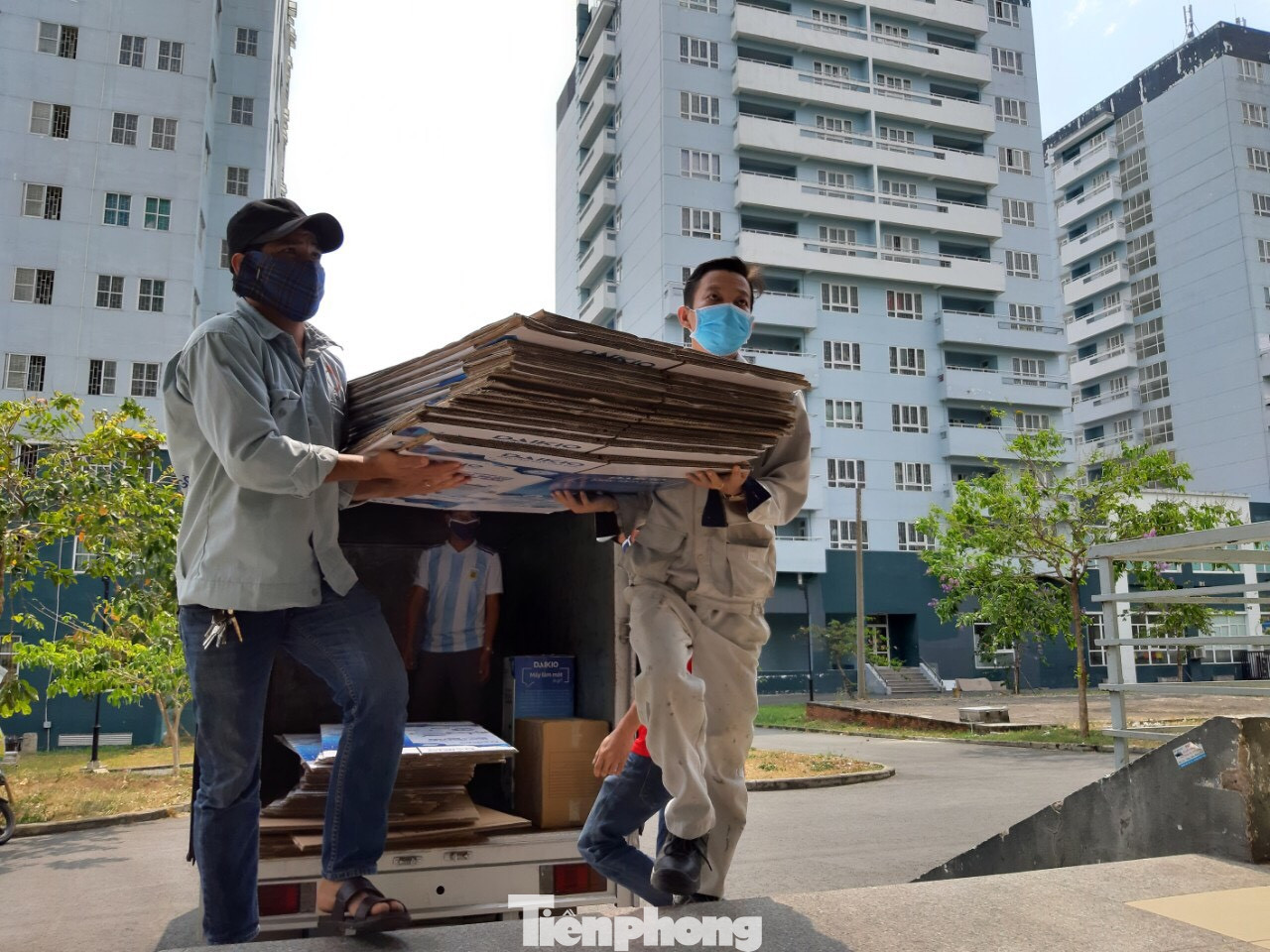 Thùng carton được các doanh nghiệp, mạnh thường quân quyên góp chở tới KTX ĐHQG TPHCM