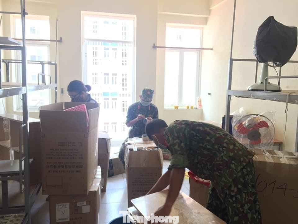 Các cán bộ chiến sĩ Trung đoàn Gia Định, Bộ Tư lệnh TPHCM đang dọn dẹp, đóng thùng đồ dùng của sinh viên để đón người cách ly