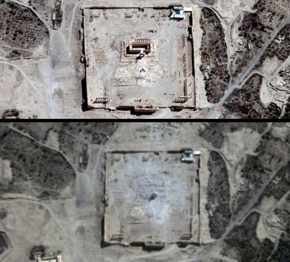 Hai tấm hình trước (ảnh trên) và sau khi đền Bel ở Syria bị những chiến binh Nhà nước Hồi giáo (IS) tự xưng phá hủy.