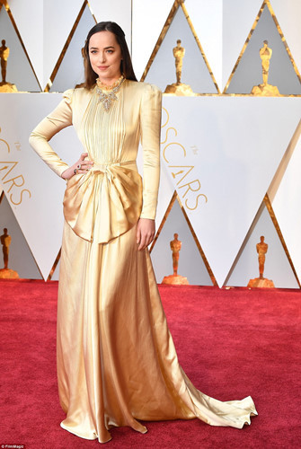Chiếc nơ to bản trên đầm của Dakota Johnson được so sánh với chiếc tạp dề trong nhà bếp. Trang phục này bị cho là đã lỗi thời tại Oscar 2017.