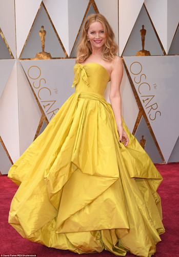 Chiếc váy màu vàng mù tạt của nữ diễn viên Leslie Mann bị chê vì phần chân váy quá rườm rà.