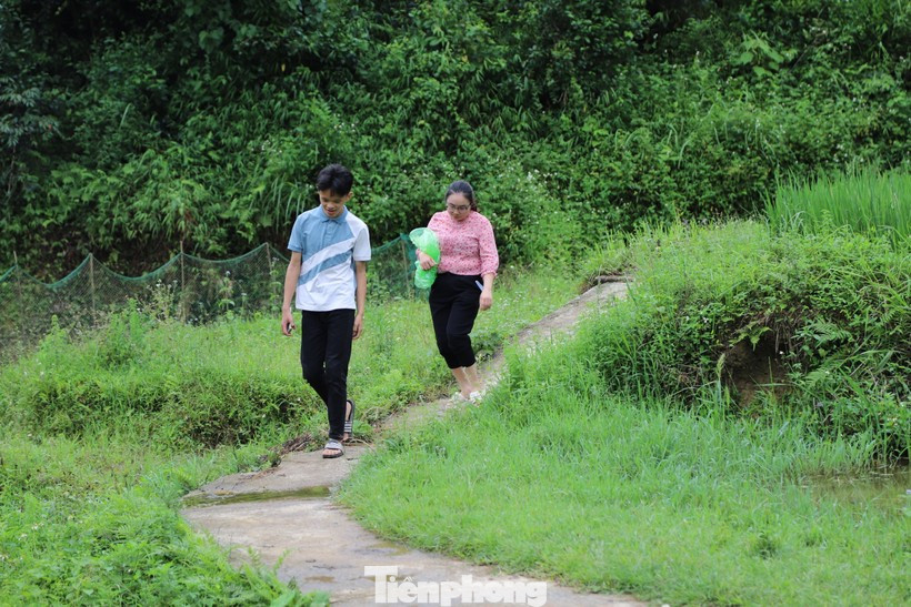 | Các thầy cô giáo, tình nguyện viên đến tận nhà đưa các em học sinh vượt qua sông, suối đến trường dự thi. Ảnh: N.C |