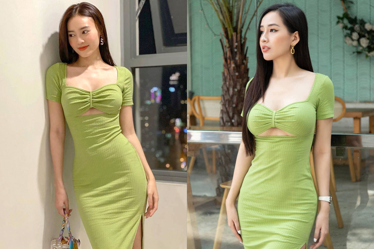 Thật không ngờ lại có ngày một cô gái mình hạc xương mai như Lan Ngọc và nàng Hoa hậu vóc dáng đáng nể Mai Phương Thúy lại đụng hàng một mẫu váy ôm sát. Khoảng trống tam giác ngay dưới chân ngực giúp hai mỹ nhân đều khoe khéo vòng 1 đầy đặn.