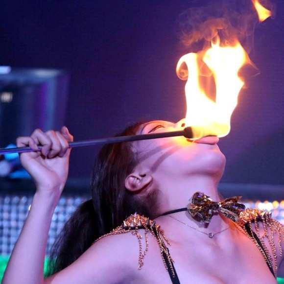 9X chia sẻ cô không hề dùng kem chống bỏng hoặc làm lửa... giả để biểu diễn trên sâu khấu. Để có những màn biểu diễn đẹp mắt, Mỹ Kim phải rèn được sức chịu đựng cao khi gần lửa và bị bỏng là chuyện thường như cơm bữa. "Giờ thì mình ít bị bỏng hơn, thường thì diễn 10 lần thì chỉ 3 lần bị. Lần mình bị nặng nhất là khi nuốt lửa quá lâu, bị bỏng rát cổ họng và hơn 1 tuần chỉ ăn được cháo, uống sữa". Ngoài bị bỏng, chuyện bị cháy xém tóc, lông mày là điều hiển nhiên" - Mỹ Kim nhớ lại. Tuy vất vả, nguy hiểm nhưng Mỹ Kim cảm thấy bản thân rất gắn bó với nghề và chưa có ý định giải nghệ. Ảnh: NVCC