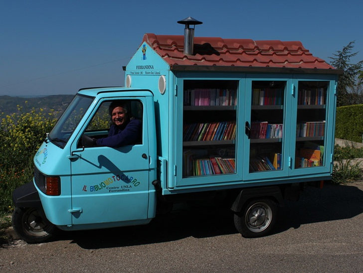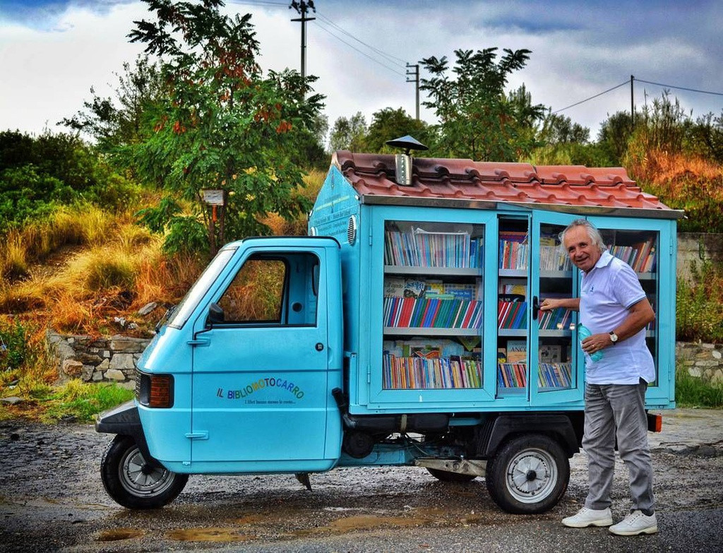 Thư viện phát nhạc - Bibliomotocarro: Antonio La Cava, một giáo viên người Italy đã nghỉ hưu, đã quyết định sau 42 năm giảng dạy, rằng mình phải làm điều gì đó để truyền bá tình yêu, niềm vui thích đọc sách cho trẻ em. Xuất phát từ điều đó, năm 2003, ông mua một chiếc xe Ape cũ và sửa nó thành thư viện di động phát nhạc mang tên Bibliomotocarro, chứa được tới 700 cuốn sách. Rong ruổi trên chiếc thư viện di động màu xanh da trời bắt mắt, ông Antonio La Cava đi vòng quanh và phân phát sách đến cho thiếu nhi.