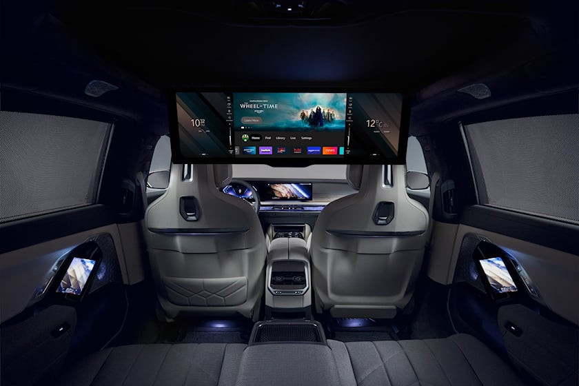 Màn hình cảm ứng 8K đầu tiên trên thế giới này sở hữu kích thước 31 inch và có thể gập xuống từ trần xe để cung cấp trải nghiệm cho hành khách phía sau. Cùng với đó, xe còn trang bị rèm che nắng làm tối cabin và hệ thống âm thanh vòm Bowers & Wilkins Diamond 36 loa mang tới trải nghiệm âm thanh 4D. Đáng chú ý, BMW đã tiếp cận nhạc sĩ từng hai lần đoạt giải Oscar mang tên Hans Zimmer để điều phối âm thanh phát ra từ hệ thống loa kể trên.