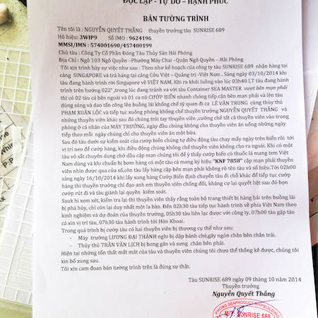 Ngày 11/10, tàu Sunrise 689 vừa bị cướp biển trở về neo đậu ở mũi Gành Rái thuộc phường 2, thành phố Vũng Tàu để phục vụ công tác điều tra. Thuyền trưởng Nguyễn Quyết Thắng đã viết bản tường trình về toàn bộ quá trình bị cướp biển khống chế, hút dầu trên biển Đông.