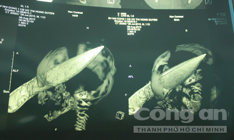 Bác sĩ Đào Trung Hiếu, Phó giám đốc bệnh viện Nhi Đồng 1 TP.HCM cho biết, con dao được lấy ra khỏi đầu cháu bé dài 28 cm, ngang 2,7 cm. Phần dao đâm ngập vào đầu khoảng 11cm.