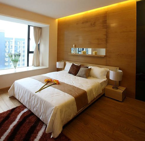 Căn phòng phong cách hiện đại với tông màu nóng và điểm nhấn sáng của tấm nệm giường ngủ.