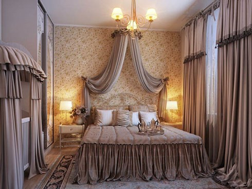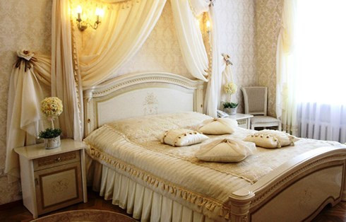 Căn phòng cổ điển với họa tiết kim loại uốn của giường và ren của thảm, chăn…