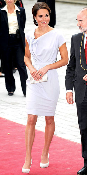 Chọn váy màu ghi giản dị của Matthew Williamson nhưng Kate vẫn nổi bật với đường viền đính đá ở cổ và tay áo.