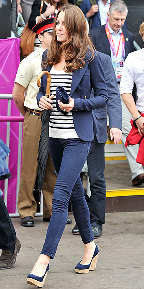 Hình ảnh hiếm hoi Kate trút bỏ những chiếc váy nữ tính để khoác lên mình phong cách thời trang khỏe khoắn với quần skinny jean hiệu, J Brand, áo khoác blazer Smythe xanh navy áo len kẻ ngang Stuart Weitzman.